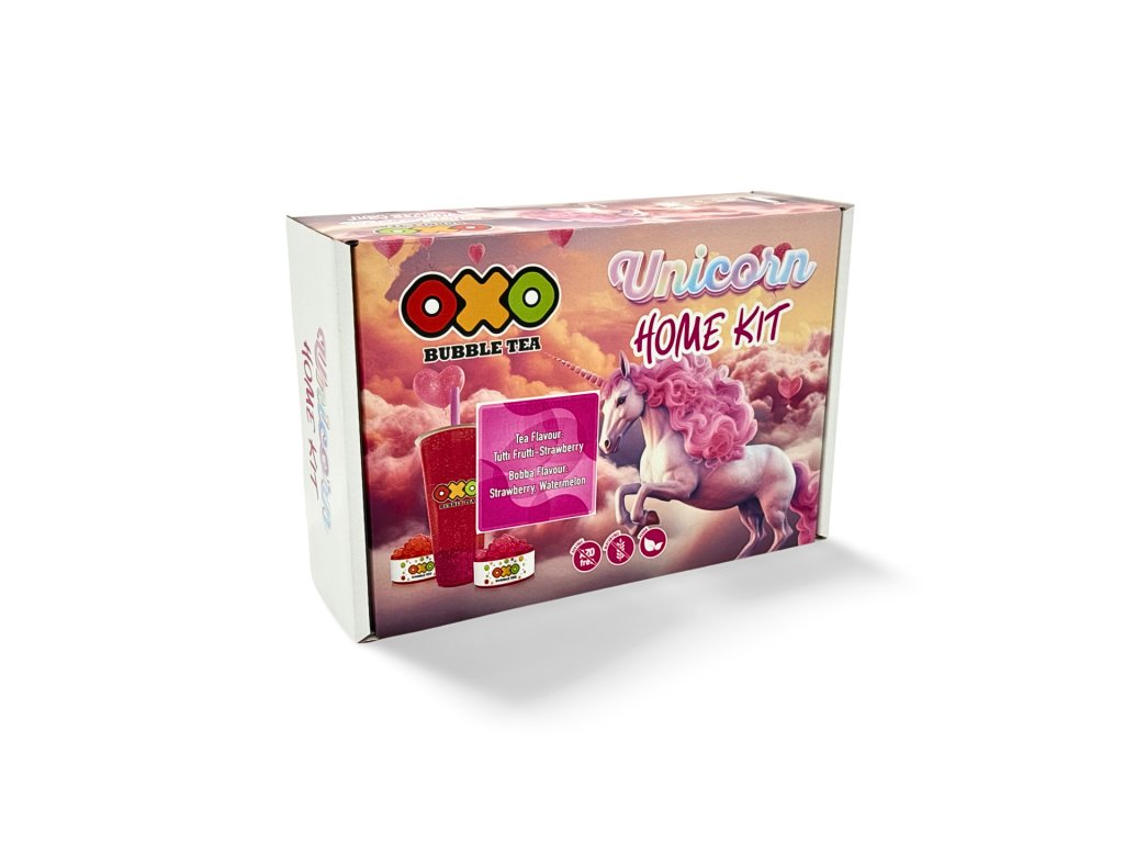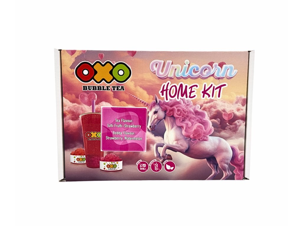 OXO Home Kit Unicorn – kompletní domácí sada pro výrobu 4 porcí barevného bubble tea inspirovaného světem jednorožců. - dárková sada 4 porce