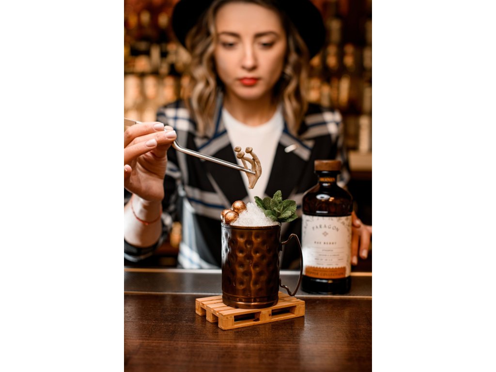 - Hydroalkoholová směs se maceruje se surovinou a poté se destiluje za atmosférického tlaku, aby se uvolnily různé chuťové profily. Tato technologie se používá pro bobule Rue i Timur.