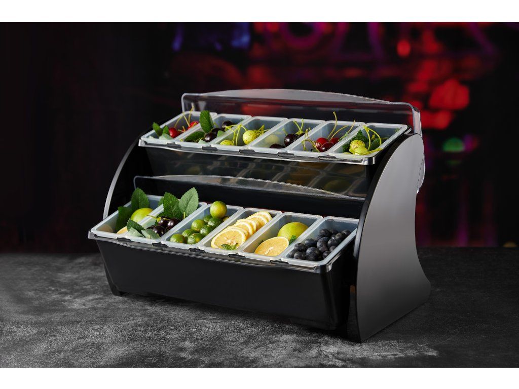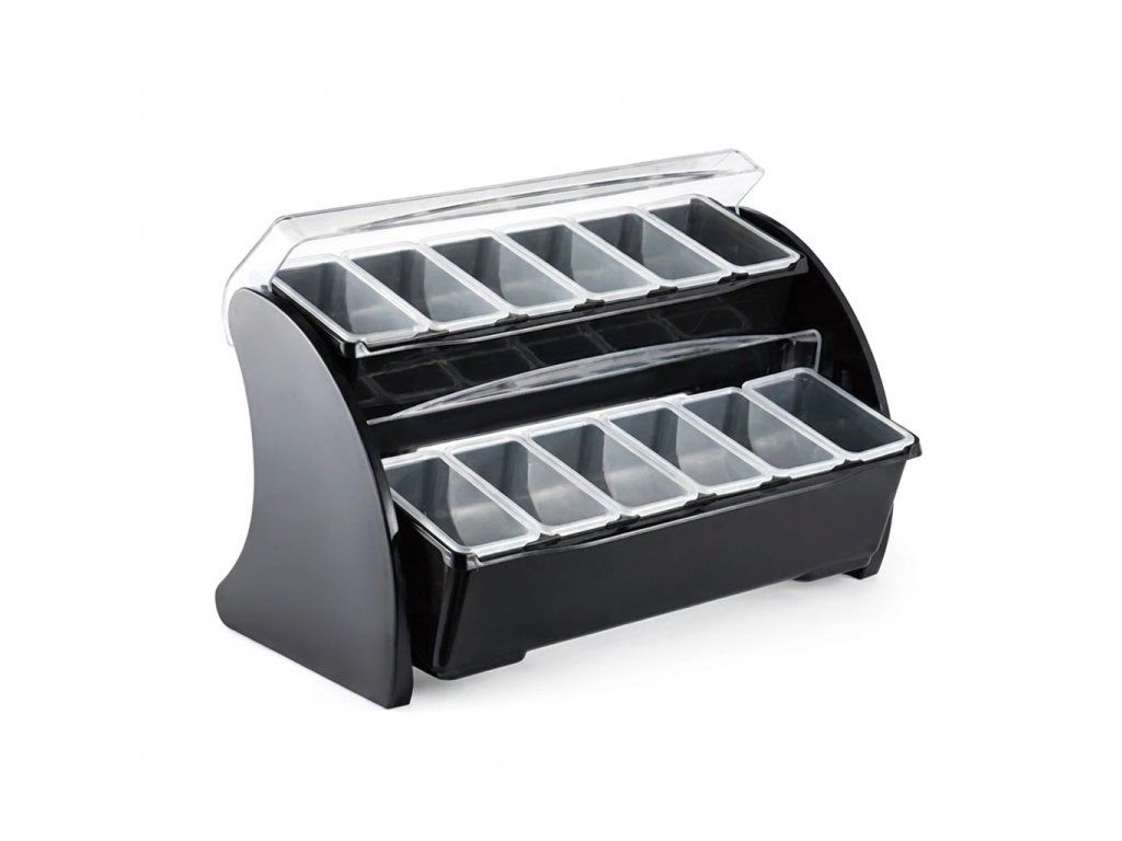 Tento dvoupatrový box na přísady či ovoce je nepostradatelným pomocníkem každého barmana. Navíc díky černému plastovému materiálu krásně vypadá. Každá ze dvanácti přihrádek má objem je vyjímatelná, tudíž se snadno oplachuje. Box má dvě patra a každé patro má průhledné otočné víko.