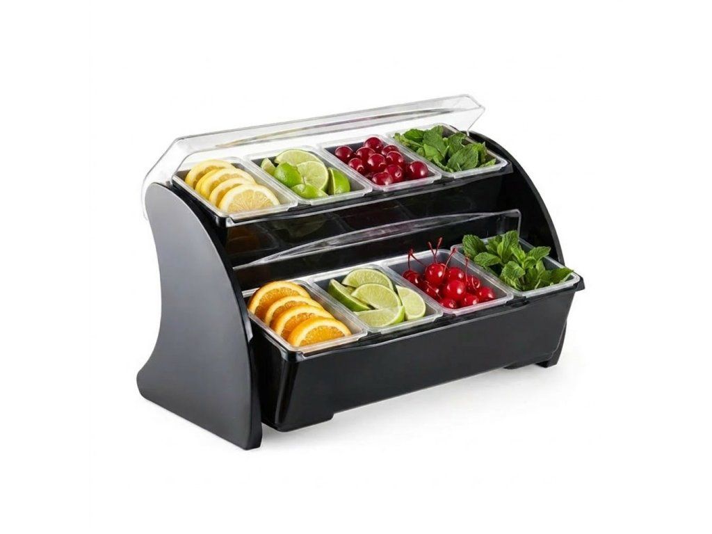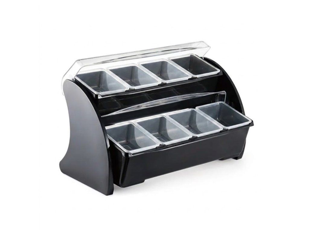 Tento dvoupatrový box na přísady či ovoce je nepostradatelným pomocníkem každého barmana. Navíc díky černému plastovému materiálu krásně vypadá. Každá ze dvanácti přihrádek má objem je vyjímatelná, tudíž se snadno oplachuje. Box má dvě patra a každé patro má průhledné otočné víko.