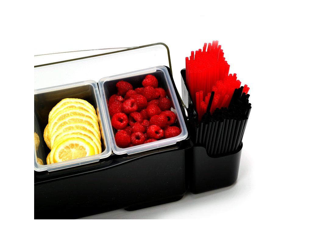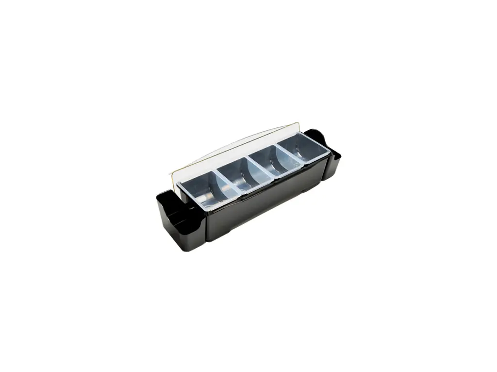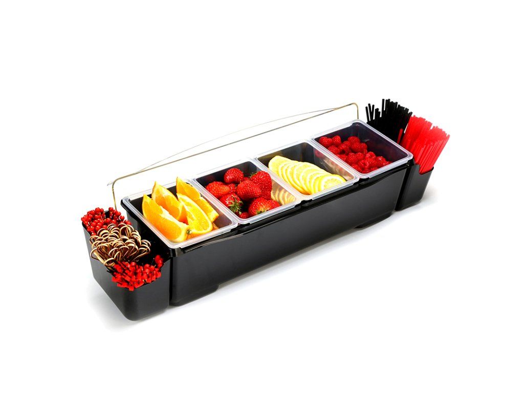 Tento box na přísady či ovoce je nepostradatelným pomocníkem každého barmana. Navíc díky černému plastovému materiálu krásně vypadá. Každá ze čtyř přihrádek je vyjímatelná, tudíž se snadno oplachuje. Box má pohodlné tvarované rukojeti a průhledné víko.