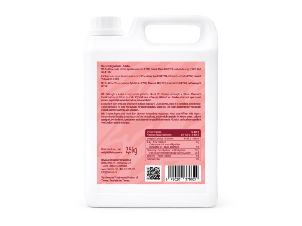 | Složení: | Fruktóza, voda, aroma, kyselina jablečná (E296), červeň allura AC (E129) sorban draselný (E202), žluť SY (E110) |