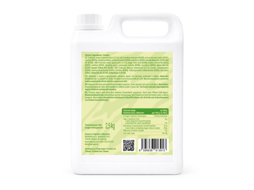| Složení: | Fruktóza, voda, kvajávový džus (3,3%), cukr, kyselina citronová (E330), aroma citronan sodný (E331), xanthan (E415), zakalovací látka, sorban draselný (E202) sukralóza (E955), červeň allura AC (E129), žluť SY (E110) |