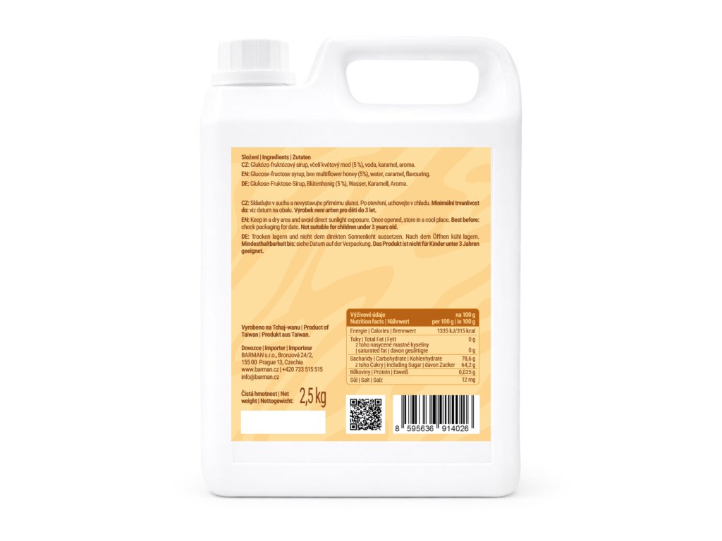 | Složení: | Glukózo-fruktózový sirup, včelí květový med (5 %), voda, karamel, aroma. |